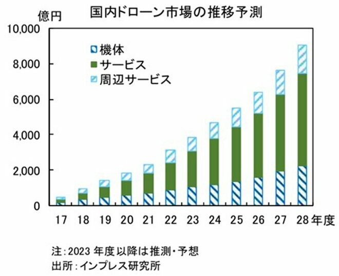 神様:その通りです。これまでドローンの飛行においては、使用規制やライセンスの導入などの安全面の仕組みづくりが行われてきたところです。今後は認可承認件数がさらに拡大することが期待されます。近年は、測量、点検、空撮や農薬散布など、ドローンの活用範囲は拡大しています。ドローンを飛ばすための申請に一回一回時間がかかっていては、実用的な運用はできません。今回の迅速化の試みは、今後の国内でのドローン活用に弾みをつけるものとなるでしょう。ドローン市場の規模も、2023年度の3,854億円から2028年度には9,054億円まで拡大することが見込まれています。