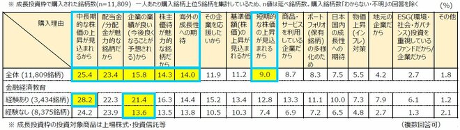 調査で興味深い点は、回答者に「金融経済教育を受けた経験があるか、ないか」についても聞いているところだ。つまり、金融経済教育の経験の有無によって成長投資枠の銘柄の購入理由に違いがあるかどうかを明らかにしている。