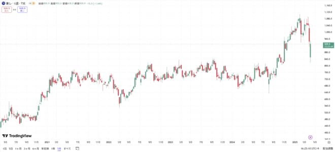 しかし、足元は乱高下の状況です。米国の関税を巡る動きや、EUによる炭素繊維の規制報道などが売り圧力となり、株価は一時818円まで下落しました。その後、相互関税の90日間停止が伝わると急反発し、株価は900円台を回復しています。