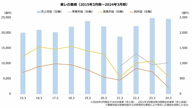 2024年3月期は営業利益が前期比47.1%減、純利益は同69.9%減と、大幅な減益でした。炭素繊維において、風力発電翼用途の需要低迷に伴う減損が生じたことが主因です。なお、非経常的な損益を除いた事業利益ベースでは堅調でした。