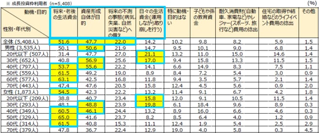 同調査によると、成長投資枠の利用者全体(5408人)の51.6%が「将来・老後の生活資金」を動機・目的として挙げている。