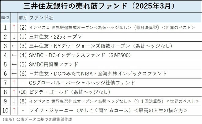 三井住友銀行の投信売れ筋ランキングの2025年3月のトップは前月の第2位から浮上して「インベスコ 世界厳選株式オープン<為替ヘッジなし>(毎月決算型)<世界のベスト>」になった。前月トップだった「三井住友・225オープン」は第2位に後退。第3位以下は、「三井住友・NYダウ・ジョーンズ指数オープン(為替ヘッジなし)」、「SMBC・DCインデックスファンド(S&P500)」、「SMBC円資産ファンド」、「三井住友・DCつみたてNISA・全海外株インデックスファンド」の順で前月と変わらなかった。第7位にトップ10圏外から「GSグローバル・パーシャルヘッジ社債ファンド」がジャンプアップし、前月は第10位だった「ピクテ・ゴールド(為替ヘッジなし)」が第8位に上がった。