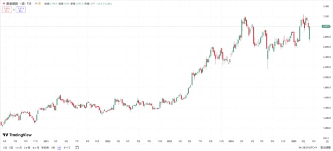 鹿島建設の株価が好調です。2023年中ごろから値を上げ始め、2024年3月には3213円の高値をつけました。その後は調整しますが、2025年3月に再び3247円の高値をつけます。