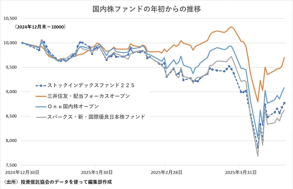 また、「One国内株オープン『愛称:自由演技』」や「スパークス・新・国際優良日本株ファンド『愛称:厳選投資』」は3月までの下落局面ではインデックスファンドを上回る下値抵抗力を見せた。4月になって「スパークス・新・国際優良日本株ファンド『愛称:厳選投資』」がインデックスファンドをアンダーパフォームしてしまっているがわずかな違いしかない。米国の関税の影響を国内企業がどのように受け止め、業績への影響を回避する経営ができるかは、現在、企業各社が知恵を絞っているところであろうし、その対策の効果について正しく業績に落とし込んで把握できるかどうかは、運用会社のアナリストやファンドマネジャーの腕の見せ所でもある。今後の動向に注目したい。