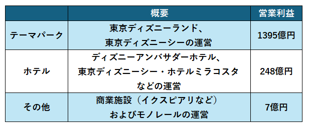 事業は主にテーマパーク事業とホテル事業の2つです。これらは米ディズニーからのライセンスに基づいて運営されています。またテーマパーク周辺の商業施設やモノレール事業も手掛けます。なお、海外向けの売り上げはありません。国内で完結するビジネスといえます。