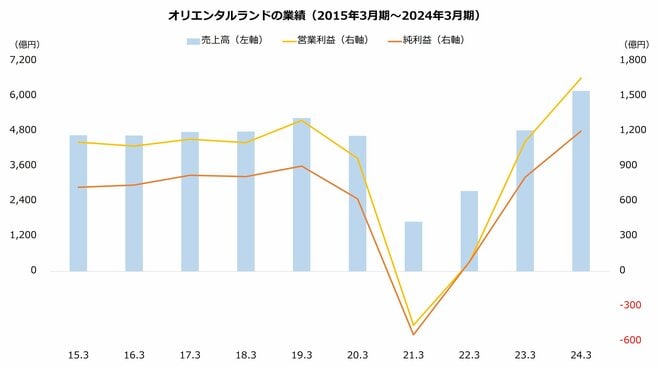 次に業績です。オリエンタルランドは新型コロナウイルスの影響で2021年3月期に542億円の最終赤字に転落しました。以降は強い回復が続いています。