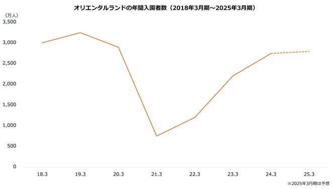株価下落の理由としてもう1つ考えられるのが入園者数です。実は入園者数はコロナ前を回復していません。2025年3月期の想定は2800万人と、ピーク(3255.8万人、2019年3月期)の86%にとどまります。オリエンタルランドは過去最高の業績を記録していますが、これはゲスト単価の改善が主因です。