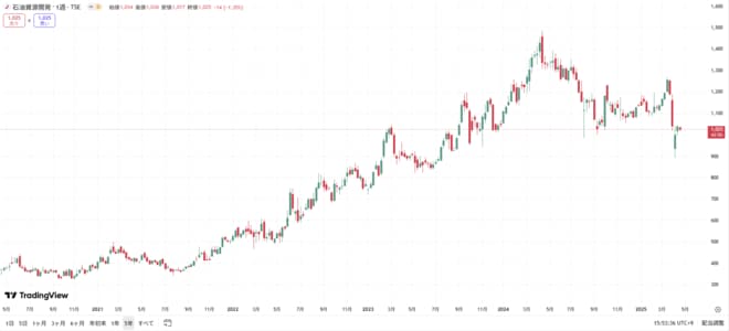 石油資源開発(JAPEX)の株価は、短期的には下落トレンドです。2024年4月の高値1458円から軟調な展開が続いており、現在は1000円前後で取引されています。これは2024年8月の日本株式の急落や2025年4月のトランプ関税なども影響しています。