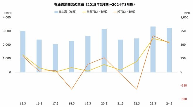 石油資源開発は2024年3月期までの10期で最終赤字を3回経験しました。最終赤字は、カナダにおける事業の取り止めや参画終了に伴う損失や、新型コロナウイルスや国内資産の減損などに起因しました。