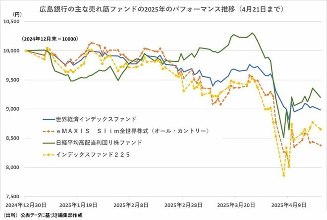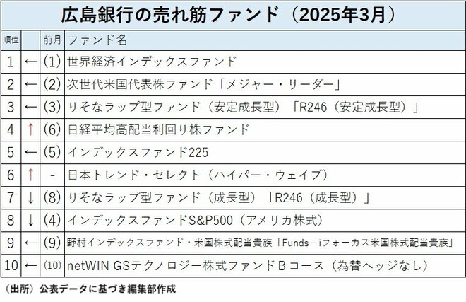 広島銀行の投信売れ筋ランキングの2025年3月のトップ3は前月と同じだった。トップに「世界経済インデックスファンド」で、第2位は「次世代米国代表株ファンド『メジャー・リーダー』」、第3位は「りそなラップ型ファンド(安定成長型)『R246(安定成長型)』」だった。前月第4位の「インデックスファンドS&P500(アメリカ株式)」が第8位に後退し、第4位には前月は第6位だった「日経平均高配当利回り株ファンド」が上がった。また、日本株市場の動きの2倍の値動きをする「日本トレンド・セレクト(ハイパー・ウェイブ)」がトップ10圏外から第6位にランクインした。