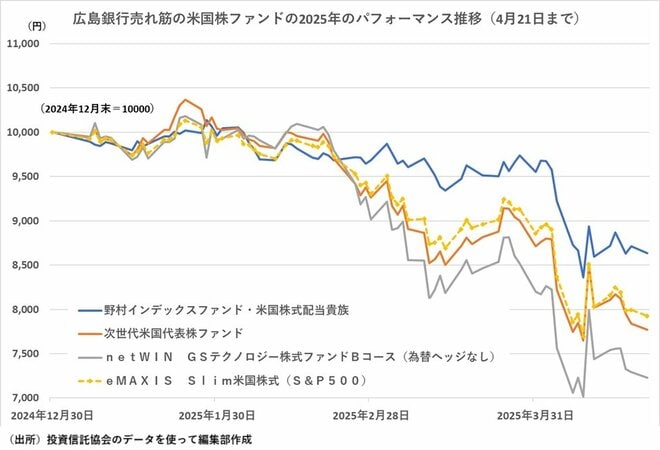 まずは、今回の米国株主導の下落相場でもっとも大きなダメージを受けているのが「netWIN GSテクノロジー株式ファンドBコース」だ。2024年までの株式市場をリードした米国ハイテク大型株が今回の下落では大きく崩れて下落率が大きくなっている。「netWIN GSテクノロジー株式ファンドBコース」も年初から30%も下落した。一方、「次世代米国代表株ファンド『メジャー・リーダー』」は株価が上昇を続けていた1月の段階では「S&P500」を上回るパフォーマンスをあげていた。それが、株価が下落に転じてからは「S&P500」を下回る動きに転じている。そして、「野村インデックスファンド・米国株式配当貴族」は下落相場の中で下値抵抗力の強さを見せているが、それでも株価下落の震源地である米国株を対象としているためか、下落率は15%程度に達しており、決して小さな下落ではない。