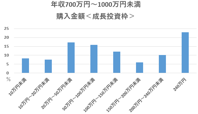 年収700万円~1000万円未満の人の成長投資枠の購入金額は、「240万円」が22.9%と最多だった。下記グラフからもその突出具合が分かる。
