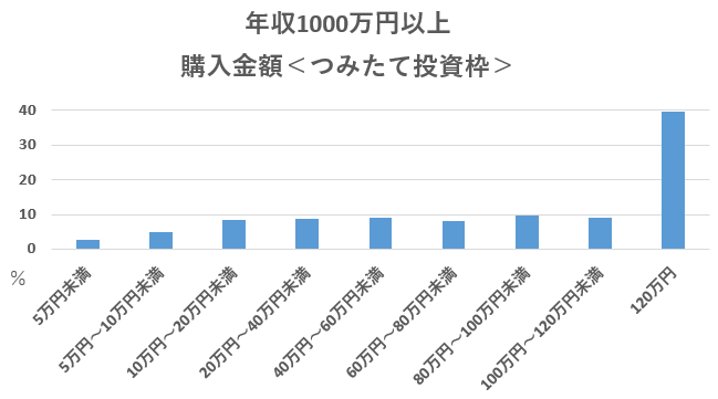 年収1000万年以上の人のつみたて投資枠の購入金額は、「120万円」が39.6%と最も多かった。約4割を占め、他の金額帯を抑えて圧倒的に高かった。下記のグラフを見ると右端の120万円が突出していることがよく分かる。