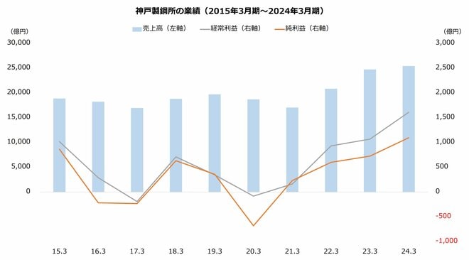 神戸製鋼所は2020年3月期まで厳しい経営環境が続きました。2017年3月期は建設機械の苦戦を主因に2期連続の純損失となり、2020年3月期はチタン事業の収益性の低下に伴う引当金計上などから再び最終赤字に転落します。