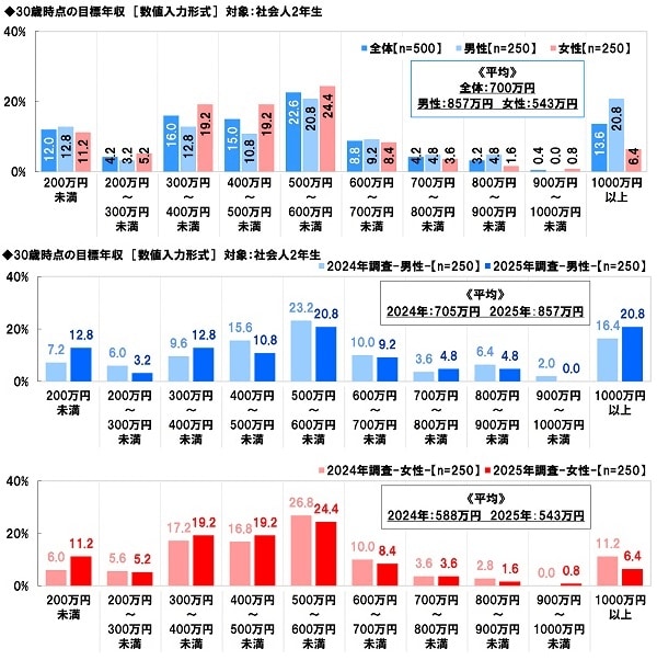 30歳時点の目標年収について、男女別や昨年からの比較でなにか傾向はあるのか。同調査の結果を男女別で見ると、平均は男性857万円、女性543万円で、男性が314万円高い。男女の賃金格差が指摘されることもあるが、目標年収にもそうした影響が反映されているのかもしれない。