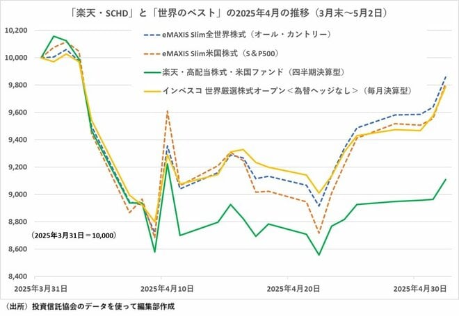 楽天証券の売れ筋トップ10でランキングを上げた「インベスコ 世界厳選株式オープン<為替ヘッジなし>(毎月決算型)」(愛称:世界のベスト)は、4月の下落相場の中で下値抵抗力の強さを感じさせる動きを見せた。4月の下落で底値となった4月9日時点の基準価額は3月末比でマイナス12.0%となり、「eMAXIS Slim 全世界株式(オール・カントリー)」のマイナス12.8%や「eMAXIS Slim 米国株式(S&P500)」のマイナス13.2%より軽微だった。その後の戻り相場でも「eMAXIS Slim 全世界株式(オール・カントリー)」と同等の値動きとなっている。市場の下落時に一定の抵抗力を示したことは評価されていいだろう。