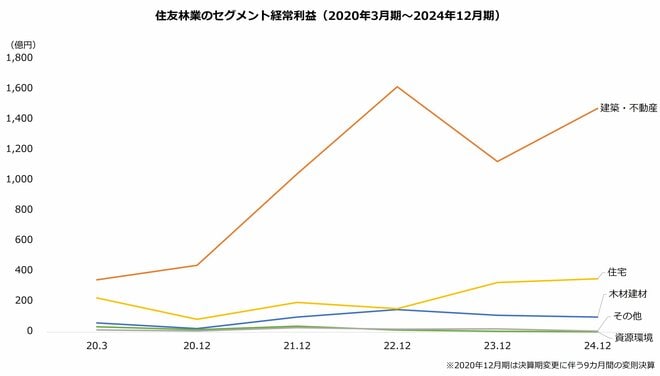 増益をけん引したのは建築・不動産事業です。コロナ禍で世界的に金利が大きく引き下げられたこと、その後の経済正常化で市場が活性化したことが追い風でした。2023年12月期は金利の上昇などから利益を減らしますが、翌2024年12月期は円安もあり増益で着地しています。