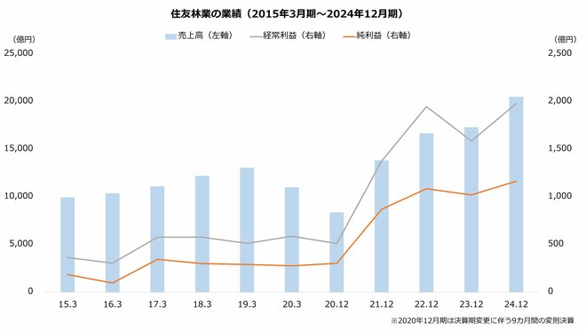 住友林業は利益の拡大傾向が続いています。業績を振り返ると、2021年12月期から利益水準が切り上がっているさまが明確です。2024年12月期は経常利益が1980億円、純利益が1165億円となり、過去最高益を達成しました。