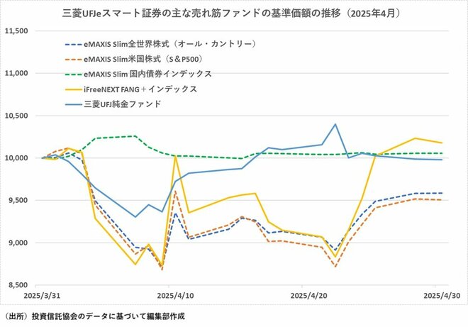 4月に世界の株価が大きく変動したが、三菱UFJ eスマート証券の売れ筋にランクインするような代表的なインデックスファンドの値動きを振り返ると「iFreeNEXT FANG+インデックス」が別格の動きをしていた。同ファンドは、「FAANMG」6社(Facebook(Meta Platforms)、Apple、Amazon、Netflix、Microsoft、Google(Alphabet))を含む、ビッグテック10銘柄で構成される株価指数「NYSE FANG+指数」に連動するインデックスファンドだ。組み入れ銘柄については2023年頃から2年以上にわたって「割高」の指摘があった。このため、米国の関税政策を巡って株式市場が不安定になると最初に下落したのが、「FANG+インデックス」に採用されているような大型ハイテク株だった。この4月でも主要インデックスファンドの中で基準価額の下落を先導したのは「iFreeNEXT FANG+インデックス」だった。ところが、株価が反転する時に、主要インデックスファンドの中で一番大きく値上がりしたのも「iFreeNEXT FANG+インデックス」だった。4月末には3月末を上回る水準に上昇した。