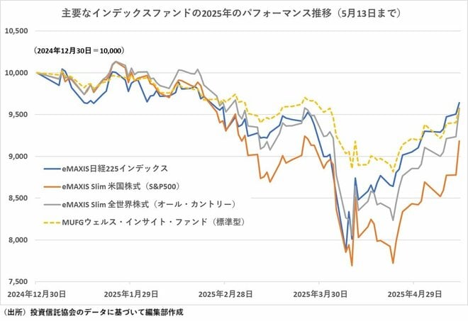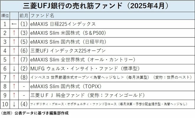 三菱UFJ銀行の投信売れ筋ランキングの2025年4月は、前月と同様に「eMAXIS 日経225インデックス」がトップになり、第2位には「eMAXIS Slim 米国株式(S&P500)」が第3位から浮上し、第3位には前月第5位から「eMAXIS Slim 国内株式(日経平均)」が浮上するなど、トップ5を代表的なインデックスファンドが占めた。前月第2位だった「MUFG ウェルス・インサイト・ファンド(標準型)」は第6位にまで後退した。また、トップ10圏外から「三菱UFJ 純金ファンド(愛称:ファインゴールド)」が第9位にランクインした。