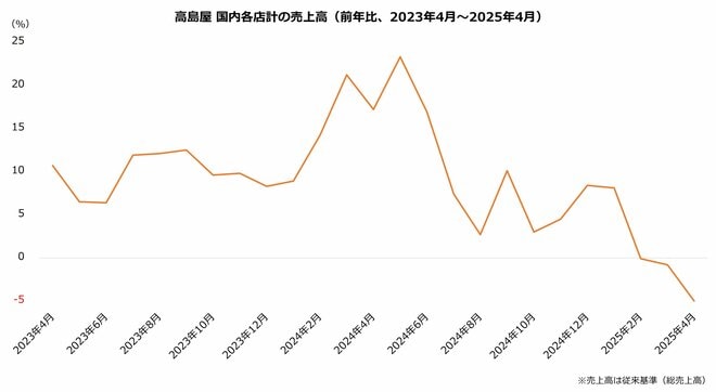 まず、国内百貨店は不透明な環境が続いています。日本百貨店協会によると、全国の百貨店売上高は2025年3月に2カ月連続で前年同月比マイナスとなりました。高島屋も、2024年に大きく成長した売上高が足元では鈍化の傾向がみられます。インバウンド売り上げも、今期は前期比で微減の想定です。