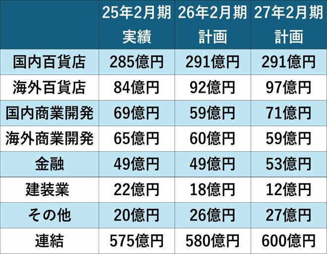 次に翌2027年2月期の見通しです。高島屋は中期経営計画(2025年2月期~2027年2月期)において、営業利益600億円を計画しています。今期の計画比で20億円の増益となり、主に国内商業開発と海外百貨店、金融がけん引する想定です。一方、主力の国内百貨店は停滞、建装業は減益を見込みます。