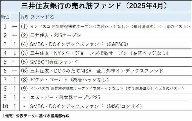 三井住友銀行の投信売れ筋ランキングの2025年4月のトップ2は前月と同様に「インベスコ 世界厳選株式オープン<為替ヘッジなし>(毎月決算型)<世界のベスト>」、「三井住友・225オープン」だった。第3位には前月第4位の「SMBC・DCインデックスファンド(S&P500)」が上がり、前月第3位の「三井住友・NYダウ・ジョーンズ指数オープン(為替ヘッジなし)」は第4位に後退した。第5位は前月と同じ「SMBC円資産ファンド」だった。また、前月第8位の「ピクテ・ゴールド(為替ヘッジなし)」は第7位に浮上し、トップ10圏外から「エス・ビー・日本株オープン225」が第9位に、「SMBC・DCインデックスファンド(MSCIコクサイ)」が第10位にランクインするなど株式インデックスファンドのランクアップが目立った。
