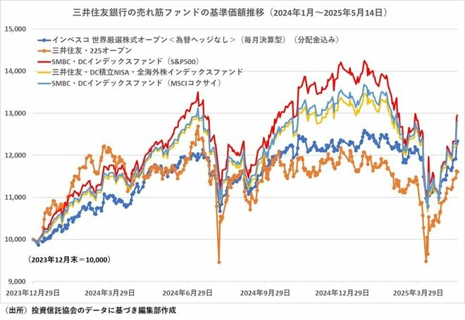 三井住友銀行の売れ筋ランキングの上位に入っているファンドの値動きを新NISAがスタートした2024年1月から振り返ってみると、売れ筋トップの「インベスコ 世界厳選株式オープン<為替ヘッジなし>(毎月決算型)<世界のベスト>」を中心に、同ファンドをアウトパフォームする「SMBC・DCインデックスファンド(S&P500)」にけん引された外国株式インデックスファンドと、「世界のベスト」を下回るパフォーマンスを続ける「三井住友・225オープン」という構図になっている。