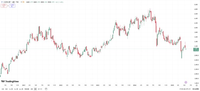 三井化学の株価チャートは大きな波長を描いています。コロナショックからの反発で2021年6月に4075円の高値を付けたあと、2022年3月に2644円まで下落しました。その後3000円前後の取引が続きますが、2023年ごろから上昇トレンドを迎え、2024年5月に4836円の高値を付けました。