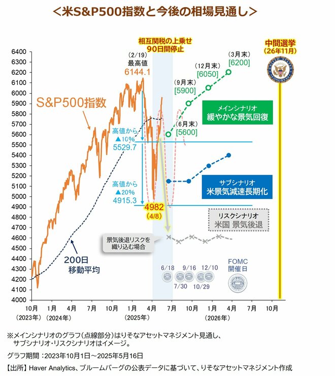 当社では、年央にはトランプ関税を巡る不透明感がある程度払拭され、株価は持続的な上昇を再開するとみています(図メインシナリオ)。来年秋の中間選挙を良い経済状態で迎えるため、トランプ政権は、関税政策の早目の決着を目指していると考えられるためです。