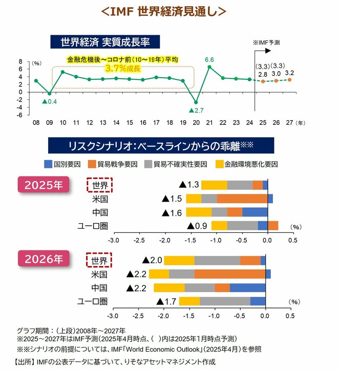 投資家は、景気と金融政策見通しをベースに運用戦略を立てます。余程大きなショックが起きない限り、その見通しは急激には変わらないものです。しかし現状は、トランプ関税の進展次第で、景気見通しは大幅に上振れ/下振れし、金融政策見通しも大きく変わり得ます。IMFは貿易戦争の激化などを想定したリスクシナリオを公表しています(図下段)。植田日銀総裁は決定会合後の会見で、中心的な見通し自体が変更される可能性が高い点を、繰り返し言及されています。2025年度については、それらの点を踏まえた上で、運用戦略を立てる必要があります。