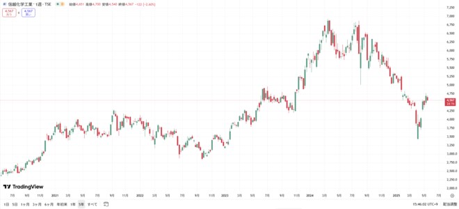信越化学工業は株価が下落しています。2024年3月の上場来高値6926円までは強い上昇トレンドでした。しかし、以降は値を下げる展開となり、2025年4月のトランプ関税ショックでは3425円の安値をつけます。