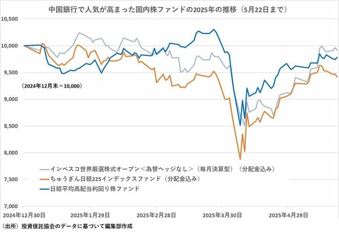 中国銀行の売れ筋上位で「ちゅうぎん日経225インデックスファンド」や「日経平均高配当利回り株ファンド」といった国内株ファンドがランクを上げている。この背景にあるのは、それぞれのファンドが示したパフォーマンスを投資家が評価したためと考えられる。