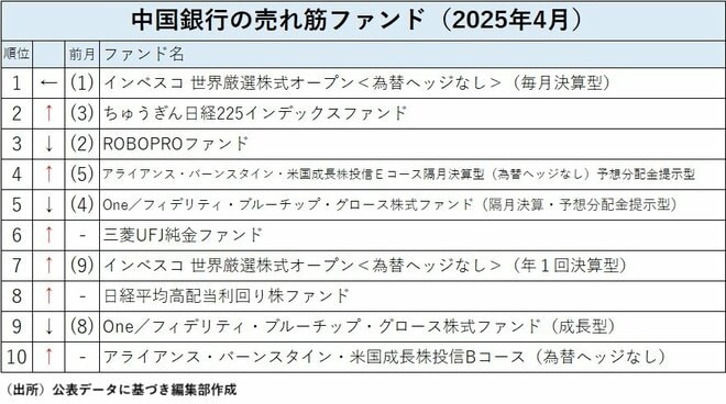 中国銀行の投信売れ筋ランキング(窓口販売)の2025年4月のトップは前月と同じ「インベスコ 世界厳選株式オープン<為替ヘッジなし>(毎月決算型)」だった。第2位に前月第3位の「ちゅうぎん日経225インデックスファンド」が浮上し、前月は第2位だった「ROBOPROファンド」は第3位に後退した。第4位には前月第5位だった「アライアンス・バーンスタイン・米国成長株投信Eコース隔月決算型(為替ヘッジなし)予想分配金提示型」が浮上した。また、トップ10圏外から「三菱UFJ純金ファンド」が第6位に、「日経平均高配当利回り株ファンド」が第8位にジャンプアップした。