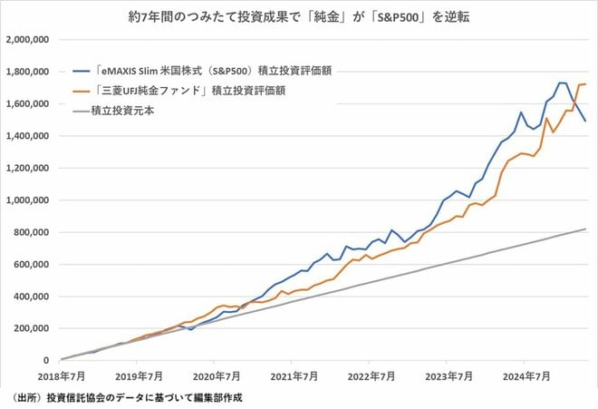 「三菱UFJ純金ファンド」と外国株式インデックスファンドの中で一番人気の「eMAXIS Slim 米国株式(S&P500)」を毎月月末に1万円ずつ積立投資を行ったとすると、2018年7月をスタートとして2025年4月まで約7年(82カ月)の積立投資評価額は、投資元本82万円に対して「三菱UFJ純金ファンド」が約172万円、「eMAXIS Slim 米国株式(S&P500)」は約149万円という結果になった。2018年7月にスタートして2018年10月から2019年2月まで、また、2019年5月から同10月まで、2020年1月から同10月までなど、「三菱UFJ純金ファンド」の評価額が「eMAXIS Slim 米国株式(S&P500)」を上回る期間はあったものの、2020年11月以降は「eMAXIS Slim 米国株式(S&P500)」が圧倒的に良い成績だった。その状況は2025年1月までは継続していたが、2月以降に「eMAXIS Slim 米国株式(S&P500)」の運用成績が悪化し、3月に逆転し、4月に優劣の差が拡大した。