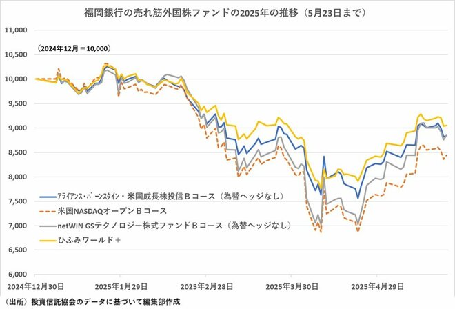 福岡銀行の売れ筋トップ10に入っている4本の外国株式アクティブファンドは、ほとんどが米国株式をポートフォリオの中心に置いたファンドであるため、4月2日に発表された米国の関税策が米国経済に与える悪影響を懸念して4月の前半に大きな下落相場になった。4月9日に付けた安値では年初からの基準価額の下落率はそれぞれ30%程度に達した。その後、関税を90日間停止すると発表したことで米国株価が戻ったが、トランプ大統領がFRB議長の解任を検討していると伝わったことで4月21日に2番底といえる下落になり、4月末時点では年初から20%程度の下落水準にまでしか戻らなかった。