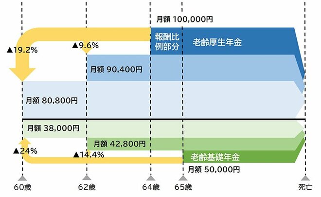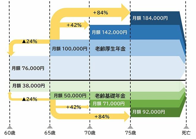 では、老齢年金の繰上げ・繰下げをもう少し詳しく見てみましょう。 例えば、65歳から受給できる年金が月額150,000円(=老齢基礎年金50,000円+老齢厚生年金100,000円)の人がいるとします。この人が60歳で受給を開始すると月額114,000円(=38,000円+76,000円)、70歳で受給を開始すると213,000円(=71,000円+142,000円)、75歳で受給を開始すると月額276,000円(=92,000円+184,000円)となります。