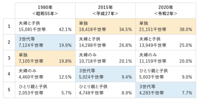図表1は、1980年時点と2020年時点の家族の姿の変化を示すデータです。単独世帯割合が大幅に増加(19.8%→38.0%)し、3世代同居世帯割合が大幅に減少(19.9%→7.7%)しています。