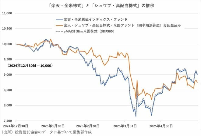 2025年の株価下落局面を振り返ると楽天証券の売れ筋で存在感のある「楽天・全米株式インデックス・ファンド」と「楽天・シュワブ・高配当株式・米国ファンド(四半期決算型)」はハイテク株投信に比べて戻りに勢いがなかった。