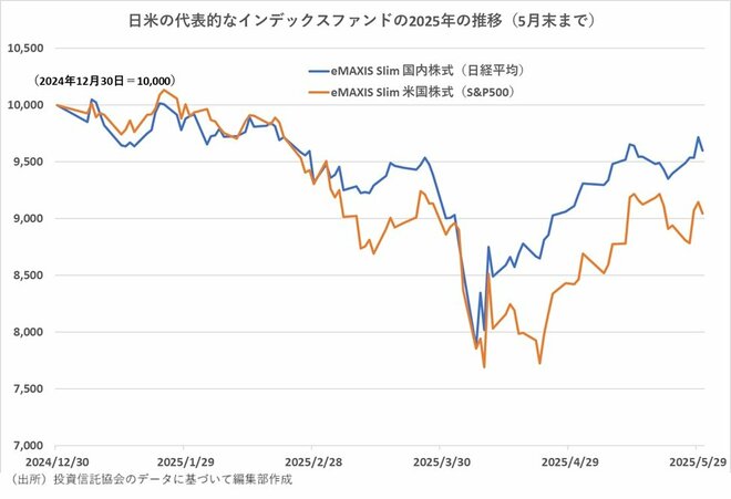 三菱UFJモルガン・スタンレー証券の売れ筋ランキングでトップに「eMAXIS Slim 国内株式(日経平均)」が入り、第5位にも「三菱UFJ インデックス225オープン」が入っているのは、2025年になってからのパフォーマンスが国内株の方が良いためだろう。2024年12月末を起点とすると、2025年5月末時点で「eMAXIS Slim 国内株式(日経平均)」はマイナス4.02%の水準にあり、「eMAXIS Slim 米国株式(S&P500)」のマイナス9.55%を上回っている。着地点だけではなく、4月上旬の株価急落時、その後の戻り過程においても一貫して国内株インデックスファンドは米国株インデックスファンドを上回る成績だった。