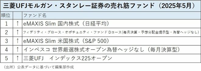 三菱UFJモルガン・スタンレー証券の投信売れ筋ランキングの2025年5月のトップ5は、「eMAXIS Slim 国内株式(日経平均)」をトップに、「フィデリティ・グロース・オポチュニティ・ファンド Dコース(毎月決算・予想分配金提示型・為替ヘッジなし)」、「eMAXIS Slim 米国株式(S&P500)」、「インベスコ 世界厳選株式オープン為替ヘッジなし(毎月決算型)」、「三菱UFJ インデックス225オープン」だった。日米を代表するインデックスファンドに加え、グローバル株式アクティブファンドがランクインしている。特に、3月まではトップ5に入っていなかった「インベスコ 世界厳選株式オープン為替ヘッジなし(毎月決算型)」が第4位に食い込んでいることが目を引く。