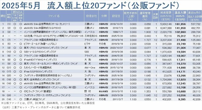 また、第4位には新規設定ファンドの「GS社債/FOLIO・AIマルチアセット戦略ファンド2025-05」が約753億円の資金流入額でランクインした。
