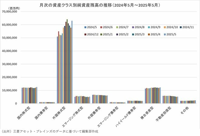 三菱アセット・ブレインズがまとめた2025年5月の公募ファンドの純資産残高は110兆2989億円で前月比6兆7553億円増加した。純資産残高が増加したのは4カ月ぶり。「外国株式型」の増加額は5兆2571億円で4カ月ぶりに大幅な資産残高の増加になった。「国内株式型」は純資産残高が4841億円増加し、「複合資産型」も4097億円の増加など、「国内債券型」(134億円の減少)を除くすべての資産クラスで純資産残高が増加した。
