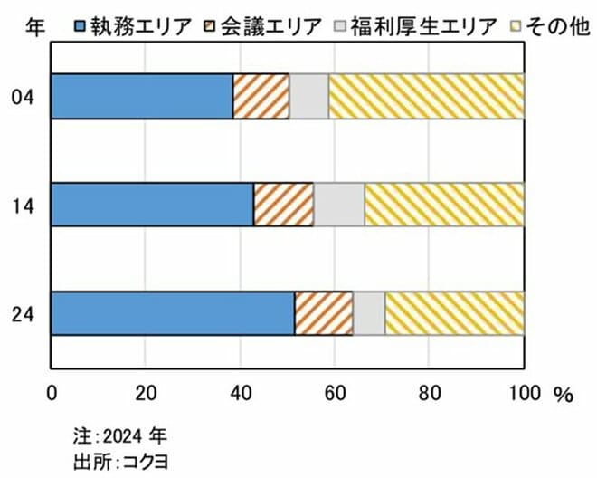 神様:オフィス内部の構成にも変化が見られます。コクヨの調べによれば、2000年代のオフィス面積比率の変化を見ると、2024年は福利厚生エリアの面積比率が低下傾向にあり、一方でゆったりとした労働環境を維持するため、執務エリアの面積比率が拡大する傾向にあります。