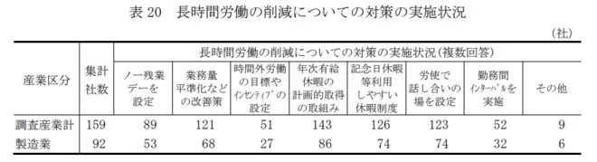 次いで多い対策が「記念日休暇等利用しやすい休暇制度」で、全体で79.2%(同126社)の企業が導入している。さらに、「労使で話し合いの場を設定」77.4%(同123社)、「業務量平準化などの改善策」76.1%(同121社)、「ノー残業デーを設定」55.9%(同89社)となっている。