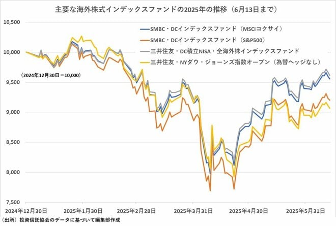 三井住友銀行の売れ筋の一角に「SMBC・DCインデックスファンド(MSCIコクサイ)」が食い込んできた。「MSCIコクサイ」は、日本を除く先進国株式インデックスとして知られている指数だ。2024年までは米国株式が世界の市場を圧倒的にリードしていたため、インデックスファンドの人気も「S&P500」に偏っていた。また、インドや中国などの新興国の成長にも目を配りたいという考えの投資家には「MSCIオール・カントリー・ワールド・インデックス(ACWI)」(除く日本)を対象とした「全海外株インデックス」が使われてきた。2024年までの人気はこの2択であり、「MSCIコクサイ」はすっかり影の薄い存在だった。