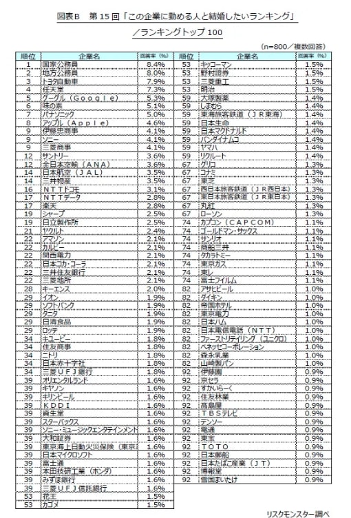 調査概要 調査名:第15回「この企業に勤める人と結婚したいランキング」調査 調査主体:リスクモンスター株式会社 調査対象:20~59歳の男女 有効回答数:800サンプル 調査対象企業と選定方法:各業界の大手企業・組織200社を抽出 調査期間:2025年3月3日~2025年3月5日