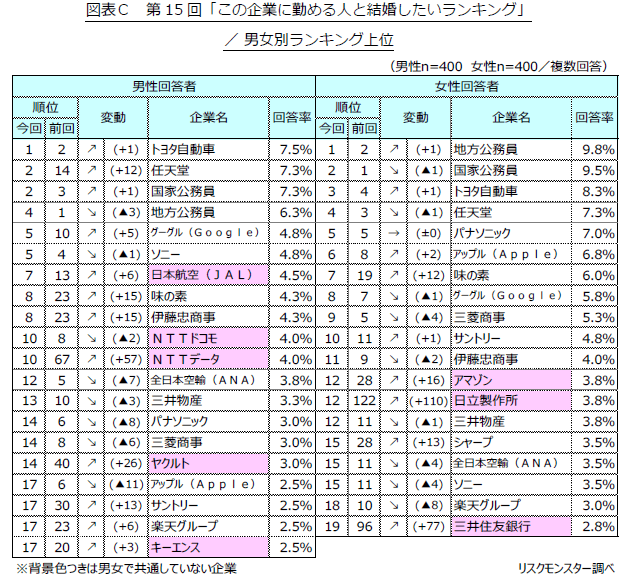 結婚相手の勤務先として望む企業について男女別ではどのような違いがあるのか。同調査によれば、男性が希望する結婚相手の勤務先1位は「トヨタ自動車」で回答率は7.5%。僅差で同率2位は「任天堂」と「国家公務員」で7.3%だった。男性の回答については、第6回調査以降、公務員がトップ2を独占してきたが、今回の調査で初めて民間企業に交代した。