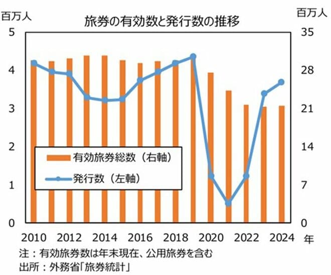 神様:よくご存知ですね。報道によると2025年には世界2位になったようです。それでも十分信用度の高いパスポートと言えるでしょう。しかし、一方で日本のパスポートの数に変化が訪れています。外務省によると、2024年の旅券統計にて2024年末時点の有効旅券数は2,159万枚であり、同時点の人口比で17.5%の人が旅券を所有しているそうです。2019年まで人口比は23%程度で推移していましたが、コロナ禍を機に落ち込み、いまだ回復していない状況です。