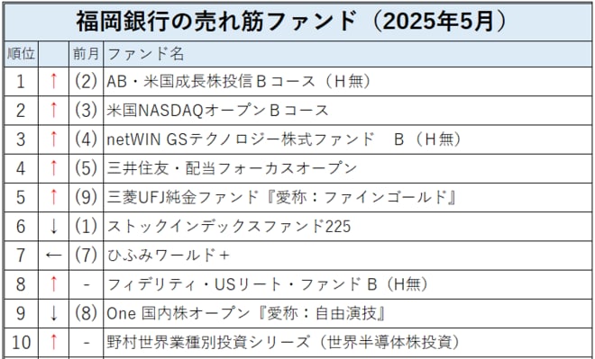 福岡銀行の売れ筋(店頭販売件数ランキング)の2025年5月は、前月トップだった「ストックインデックスファンド225」が第6位に後退し、前月第2位の「アライアンス・バーンスタイン・米国成長株投信Bコース(為替ヘッジなし)」以下、「米国NASDAQオープン Bコース」など第5位までのファンドの順位が繰り上がった。また、前月第9位だった「三菱UFJ純金ファンド」が第5位にジャンプアップした。トップ10圏外から第8位に「フィデリティ・USリート・ファンド B(H無)」が、第10位に「野村世界業種別投資シリーズ(世界半導体株投資)」がランクインした。